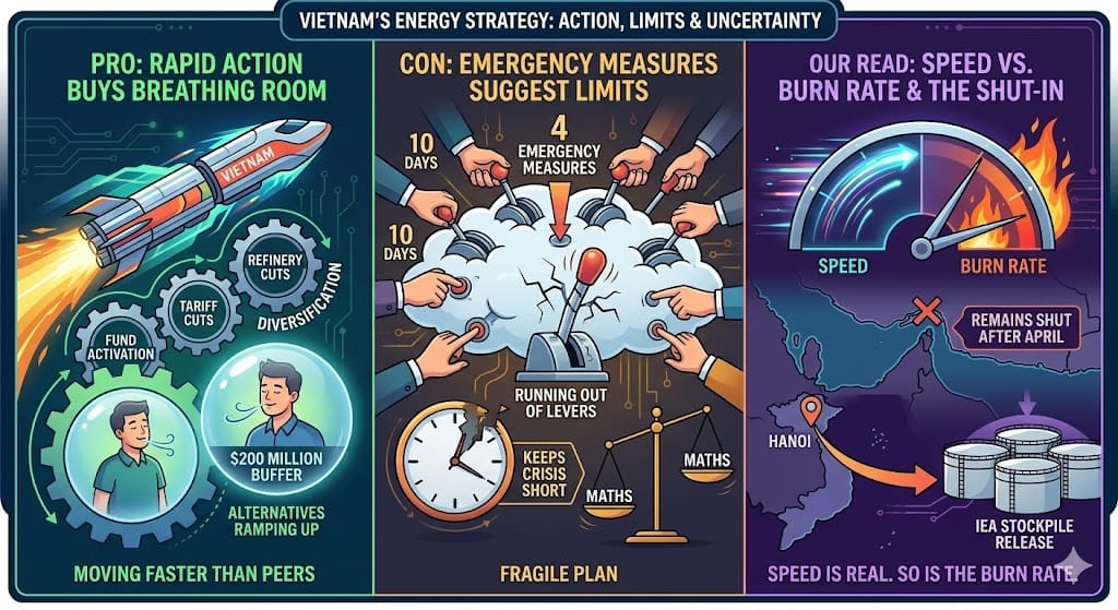 Our read: Vietnam's speed is real. So is the burn rate. If Hormuz remains shut after April, Hanoi will need the IEA's stockpile release more than its own funds.