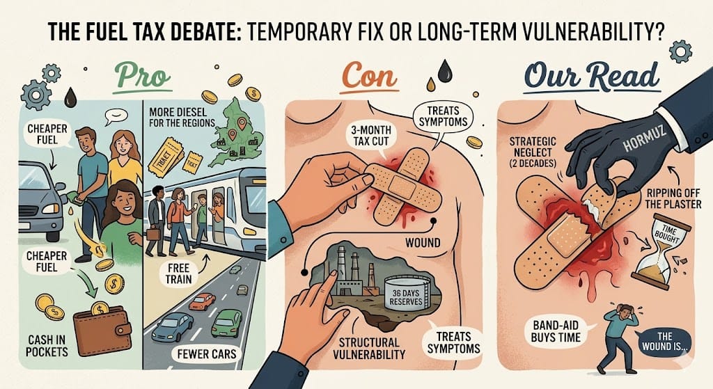 Con: A three-month tax cut treats symptoms, not the structural vulnerability of a nation with two refineries and 36 days of reserves.