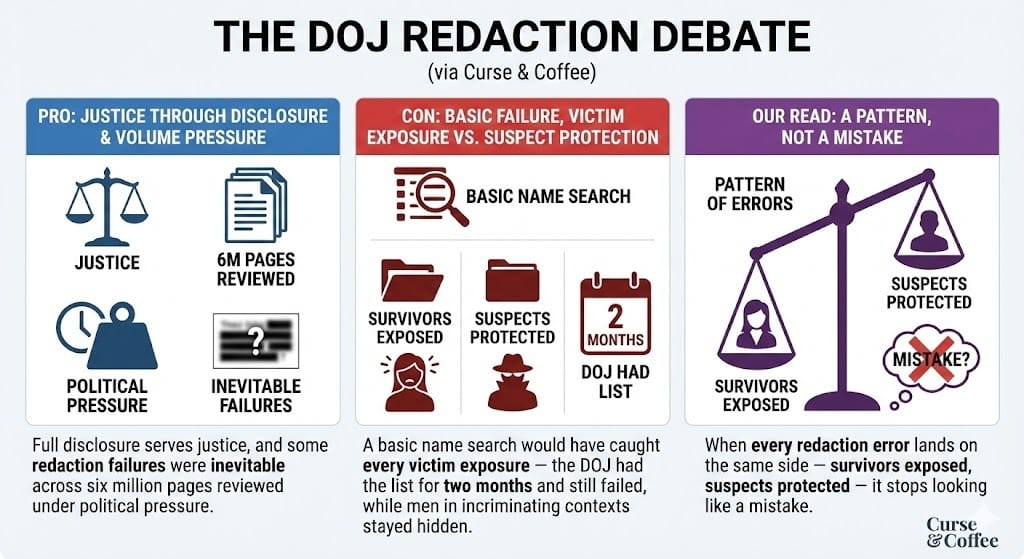 Con: A basic name search would have caught every victim exposure — the DOJ had the list for two months and still failed, while men in incriminating contexts stayed hidden.