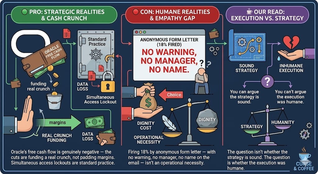 Pro: Oracle's free cash flow is genuinely negative — the cuts are funding a real crunch, not padding margins. Simultaneous access lockouts are standard practice in mass layoffs to prevent data loss.