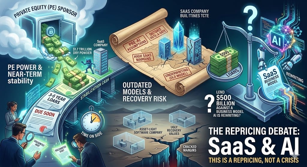 Our read: This is a repricing, not a crisis — but the question of whether you can lend $500 billion against a business model AI is rewriting isn't going away.