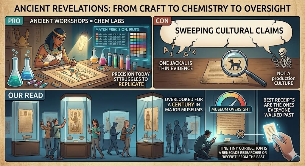Pro: The discovery shows ancient workshops doubled as chemistry labs — craftspeople matched pigment to surface with a precision we'd struggle to replicate casually today.